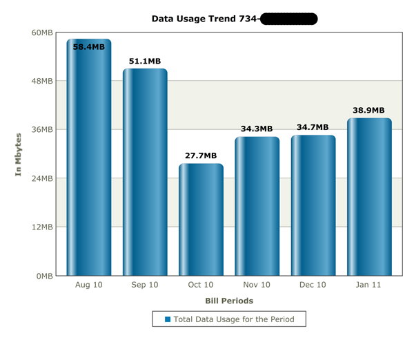 Basically I don’t use much data. That doesn’t mean I don’t use my iPhone. Over the summer ATT announced that they were adding two tiers of data and new customers would have to choose on of them. I was grandfathered in with the Unlimited, but could still switch to the 200 MB of data per month ($15) or 2 GB ($25). I thought: I bet I use less than 2GB and could switch to the 2GB plan and save $5 a month. Also my wife and I were both unemployed at the time and saving was a good idea. So I pulled up the website and looked at a 6 month graph of my data usage. I was shocked. The most I had used was 80MB in a month, and that was about 20MB higher then other months. So needless to say I decided to save $15 a month and get the 200MB plan.