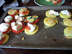 We had a log of the polenta that looks like breakfast sausage and I cut that into round slices. I then fried them (more on that later). and then topped them with some other stuff we had: leftover chicken sausage from Labor Day, zucchini, tomatoes from the garden, and some with goat cheese, others with cheddar. Finally I popped them under the broiler for a few minutes, and they were done.